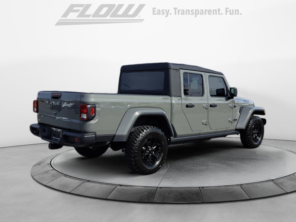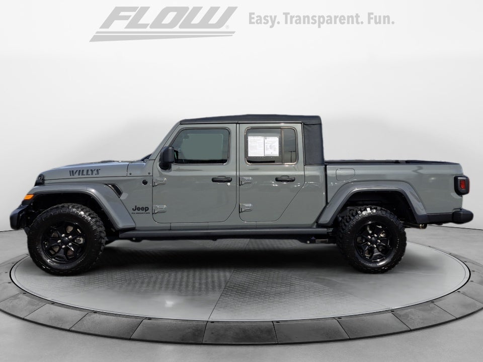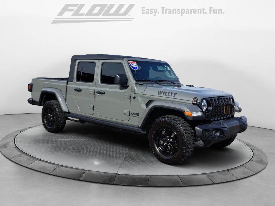Our 2021 Jeep Gladiator Willys seamlessly combines true Jeep off-road capability with everyday truck versatility. The 6-speed manual transmission enhances the driving experience, making it even more engaging. Built for drivers seeking control, character, and trail-ready confidence, this Gladiator honors Jeep's rugged heritage.Willys Off-Road Capability: The Willys trim features aggressive styling, off-road-focused hardware, and Jeep's legendary 4x4 capability, making it ready for any trail, mud, or adventure.6-Speed Manual Performance: Row your own gears for a more connected driving experience, giving you complete control whether you're crawling off-road or cruising the highway.Rugged Interior: Durable materials, supportive seating, and a functional layout are designed to handle dirt, weather, and daily use with ease.Technology & Convenience: Enjoy touchscreen infotainment with smartphone integration, steering-wheel controls, and modern features that balance ruggedness with comfort.Safety & Confidence: Stability control, traction management, multiple airbags, and Jeep's proven engineering give you confidence on and off the road.Design & Utility: Experience iconic Jeep styling, removable top and doors, bold Willys badging, and a functional truck bed that adds real-world versatility.Why Buy from Flow Automotive: At Flow Automotive, buying pre-owned is always Easy, Transparent, and Fun! We keep things straightforward while delivering quality vehicles and great service.Trail-ready, manual-equipped, and packed with personality, the 2021 Jeep Gladiator Willys is built for drivers who want more than ordinary. Come check it out today!FLOW CERTIFIED 4YR/100,000 MILE POWERTRAIN WARRANTY, 3 day money back guarantee, and a free maintenance package! *** All of our cars go through a comprehensive QRP Quality Renewal Process. Come check out Flow GM Auto Plaza's No haggle, No Pressure, Transparent, Easy, Fun, car shopping experience!! We have the most professional and courteous sales staff in North Carolina. Call our Internet Sales Dept at (336) 760-7077 to schedule a test drive, or visit https://www.flowauto.com . Thank you for allowing us to serve your automotive needs over the past 50 years.