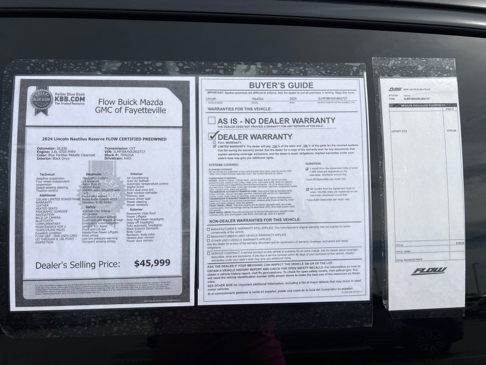 Flow Buick Mazda GMC of Fayetteville is pumped up to offer this beautiful 2024 Lincoln Nautilus Blue Panther Metallic Clearcoat Reserve with the following features: FLOW CERTIFIED 4YR/100 000 MILE POWERTRAIN WARRANTY 3 day money back guarantee and a free maintenance package! ** 100 000 LIMITED POWERTRAIN WARRANTY LEATHER HEATED SEATS PANORAMIC SUNROOF NAVIGATION BACK UP CAMERA Bluetooth® COMPLIMENTARY MAINTENANCE FOR 2 YEARS/24 000 MILES Excellent condition FLOW QRP - OUR USED CARS GO THROUGH A 146 POINT INSPECTION No accident history on Carfax One owner local trade Nautilus Reserve FLOW CERTIFIED PREOWNED 4D Sport Utility 2.0L GTDI FHEV CVT AWD Blue Panther Metallic Clearcoat Black Onyx Leather 110V Power Converter Auto Air Refresh Black Exterior Elements Body Color Digital Scent Equipment Group 202A Hands-Free Power Liftgate Jet Appearance Package (87T) Lincoln BlueCruise Equipped (4-Years Included) Navigation System Panoramic Vista Roof Rear Heated Seats w/Switch Control Revel Audio System w/14 Speakers & HD Radio Wheels: 22" Satin Dark Luster Nickel. Priced below KBB Fair Purchase Price!