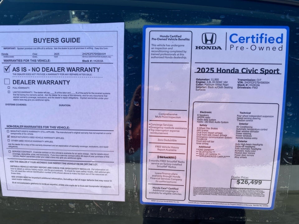 Flow Honda is honored to offer this great-looking 2025 Honda Civic Platinum White Pearl Sport with the following features: