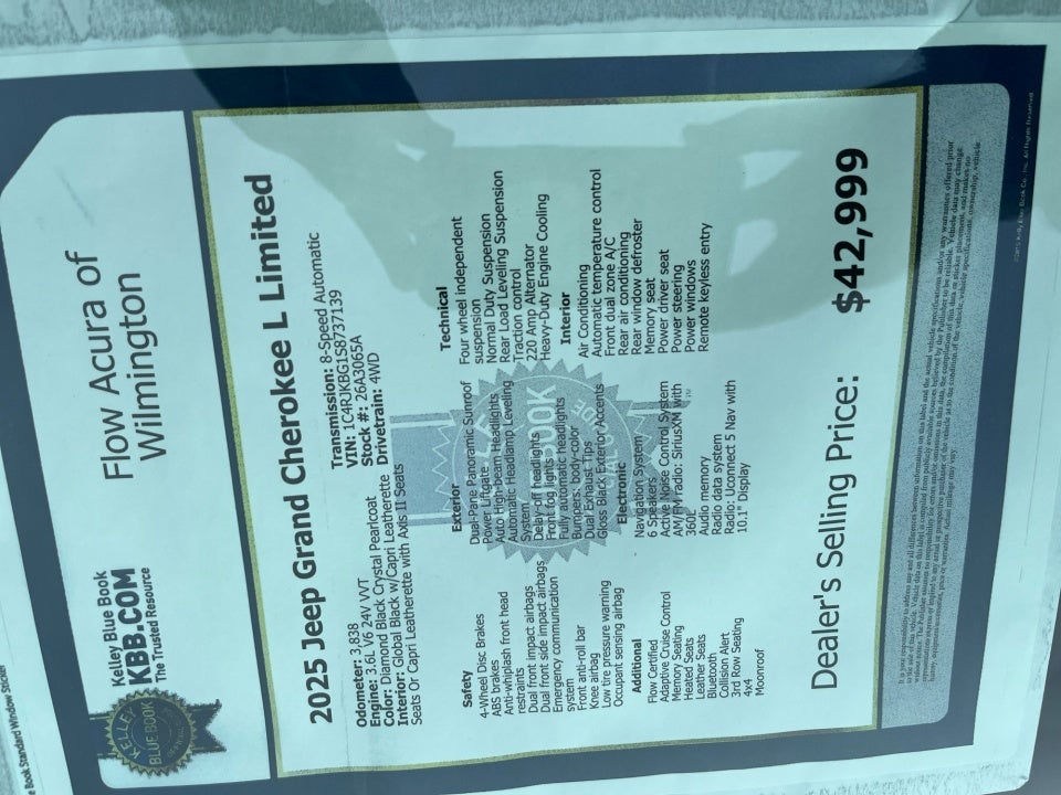 Flow Acura of Wilmington is delighted to offer this attractive 2025 Jeep Grand Cherokee L Diamond Black Crystal Pearlcoat Limited with the following features: